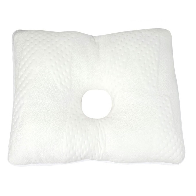 Almofada de dormir com furo no meio, adequada para um descanso correto e ideal na prevenção de úlceras de pressão na zona da orelha, de doentes acamados. Também é muito eficaz em situações de pós-operatório.